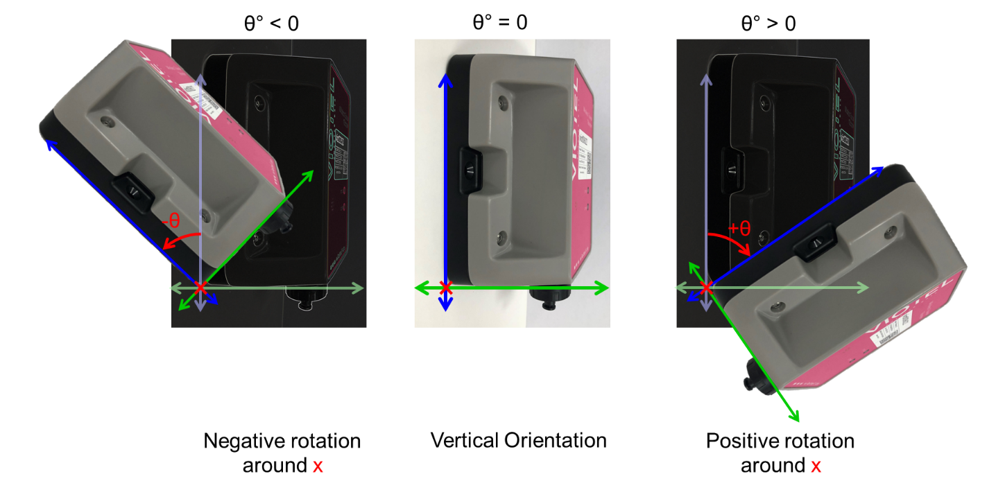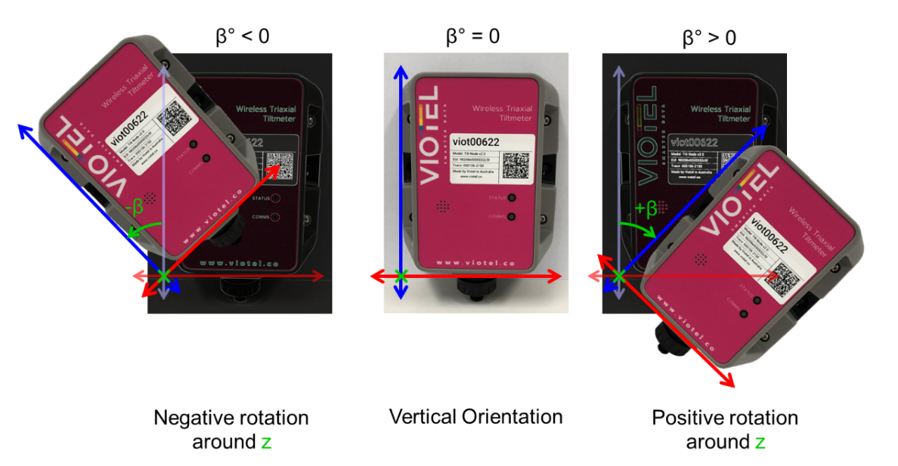 With the Viotel logo legible and node viewed from the left; a clockwise rotation around the horizontal axis (X Axis) will produce a positive angular change. Anticlockwise rotation around the horizontal axis (X Axis) will produce a negative angular change.